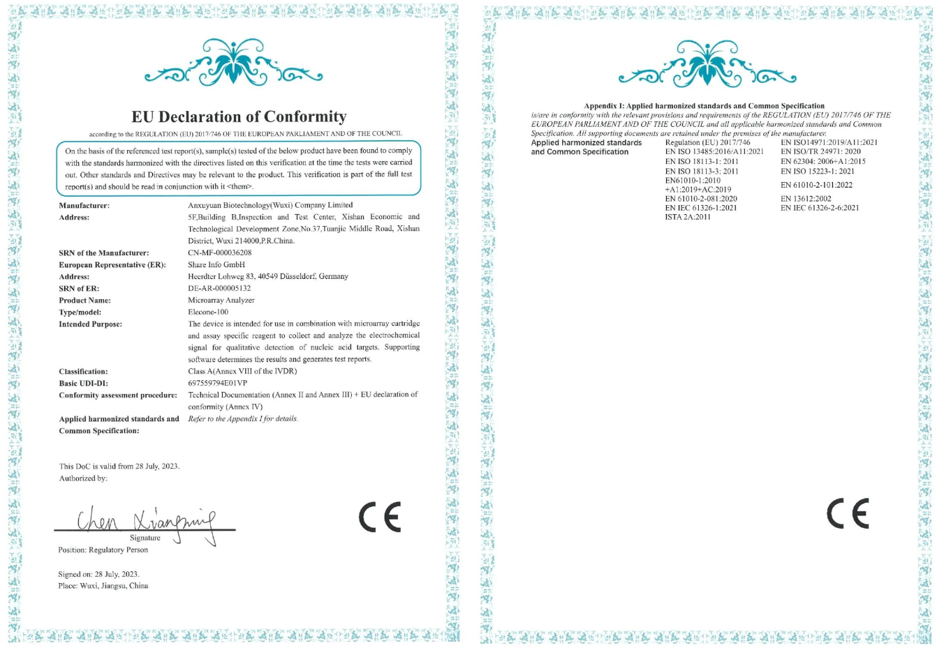近日,由安序源自主研发的微阵列芯片检测仪Elecone-100获得CE准入资质,可正式在CE认证国家进行销售流通。至此,安序源将正式为全球客户提供更加灵活的超低成本多重检测产品。