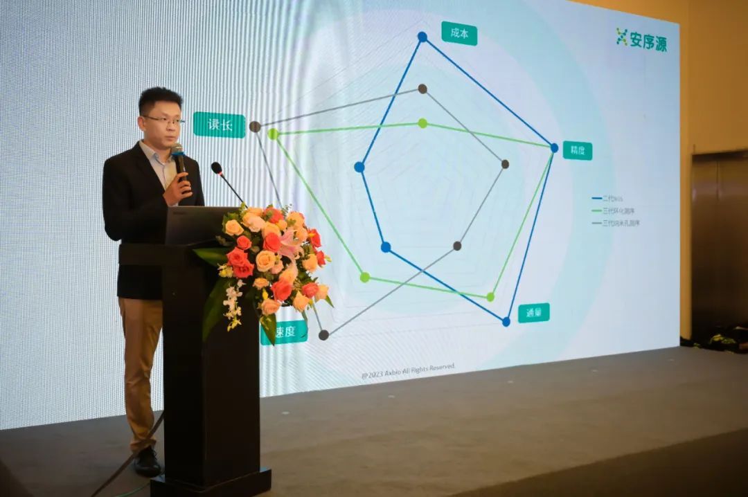 安序源产品总监涂浩波进行了安序源新产品介绍。使用硅基芯片作为承载基质,通过独创的交流电阻抗的方式检测信号,这是安序源有别于主流二三代测序产品的技术路径,可有效降低成本。这也是作为融合了半导体技术的安序源,进行测序创新的极大优势。