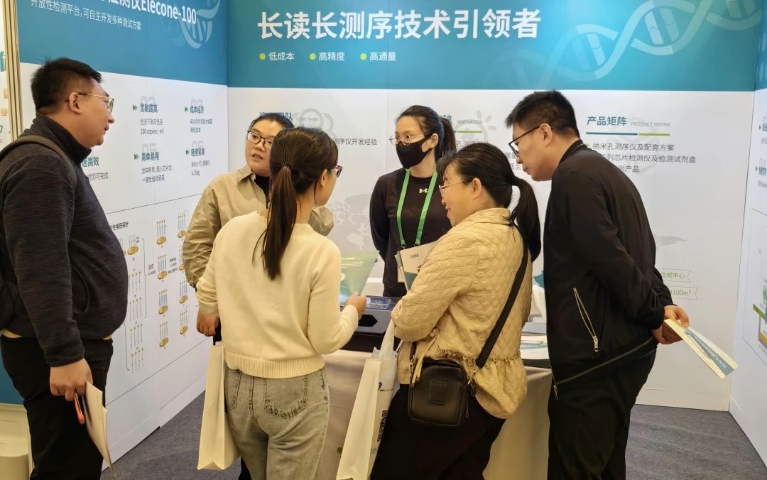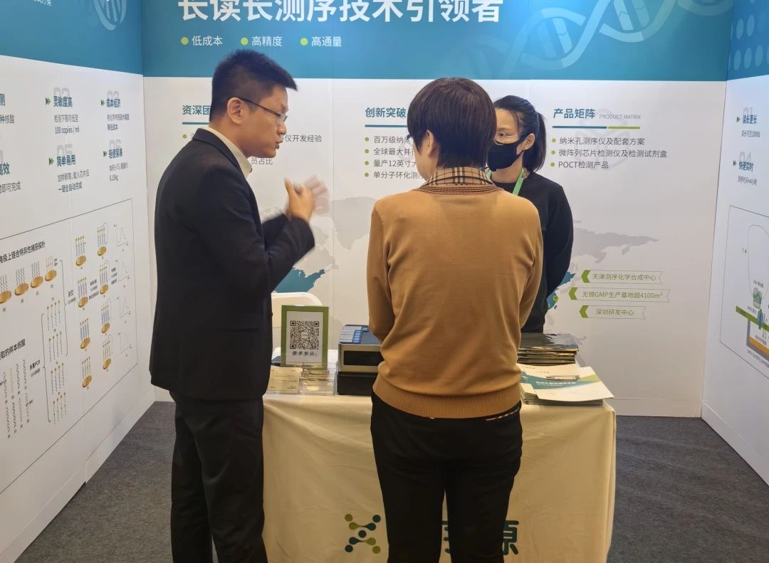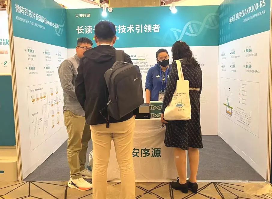 不少来访专家学者驻足展台了解安序源的技术路径,其中对于安序源如何发挥第四代测序技术以及其相较目前其他测序技术有怎样的优势表现出浓厚的兴趣——安序源通过结合纳米孔边合成边测序 + 环化一致性测序(CCS)物理校正 + CMOS芯片电信号检测等技术的特长,在读长、通量、准确度、时间、成本上做了更进一步的取舍与平衡,使之既能实现一代测序的精准度与二代测序的高通量和低成本,还能在较长读长(10~100K)下降低组装拼接的难度和错误,可用于更多应用领域的开发和探索。